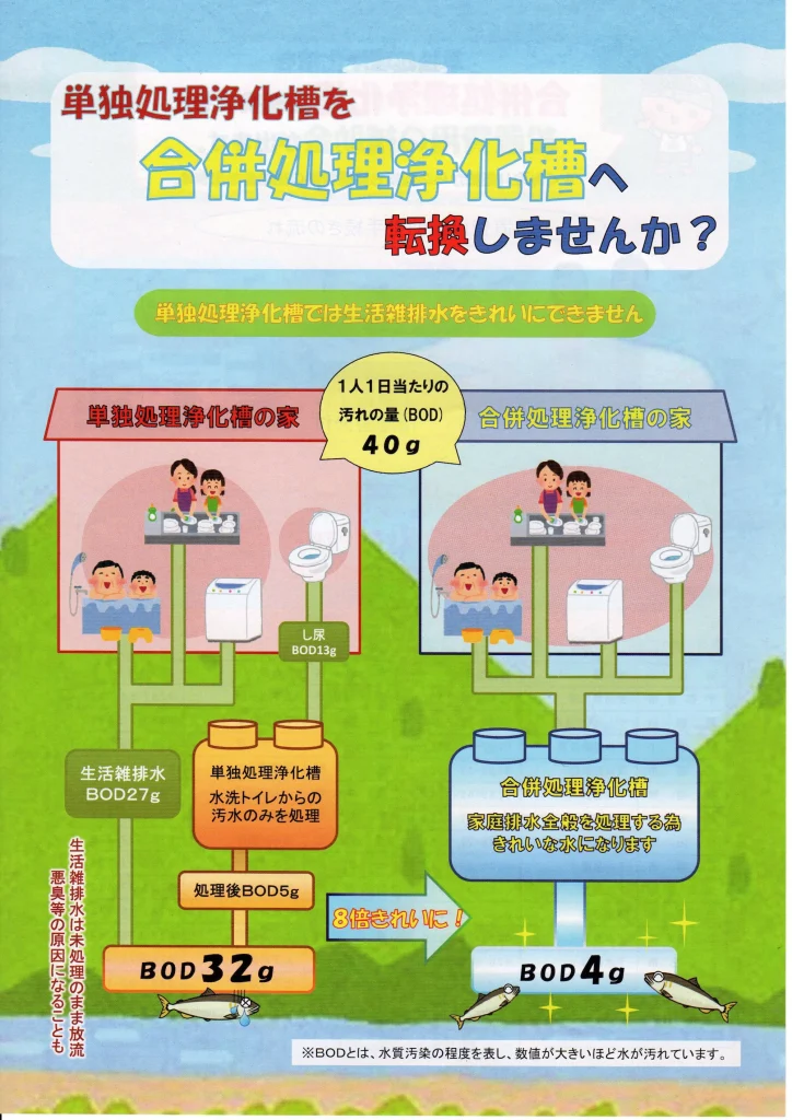 生活汚水を公共下水道へ排出することにより浄化槽、便槽がいらなくなり、臭気、虫の発生が無くなり維持管理費、汲取り費、ブロアー等の電気代が不要となります。